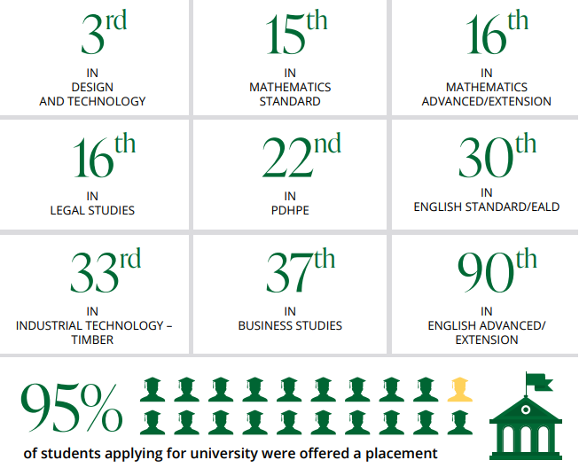 The achievement is not in a narrow band of high-performance subjects like Mathematics, rather it is across an incredibly broad range of subjects. We have seen the College ranking 3rd in the State in Design & Technology, 15th in Mathematics Standard, 16th in Mathematics Advanced/Extension, 16th in Legal Studies, 22nd in PDHPE, 30th in English Standard/EALD, 33rd in Industrial Technology - Timber, and 37th in Business Studies. With 800 schools in NSW, and thousands of students studying in selective schools, our results continue to show evidence of the hard work and commitment of staff and students as learners. We are proudly a comprehensive boys’ school that does not offer academic scholarships to slue results, nor do we limit academic pathways.